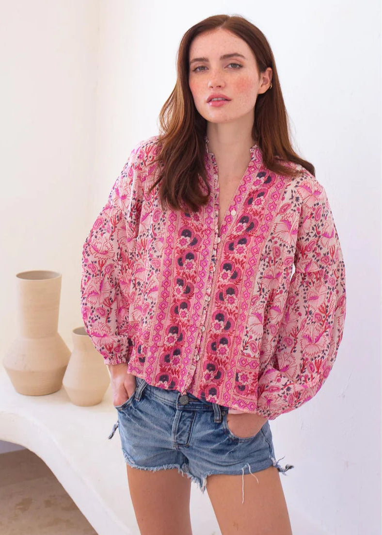 Silk cotton voile hand blocked top with 3/4 balloon sleeves, button up detailing, and ruffle neckline.