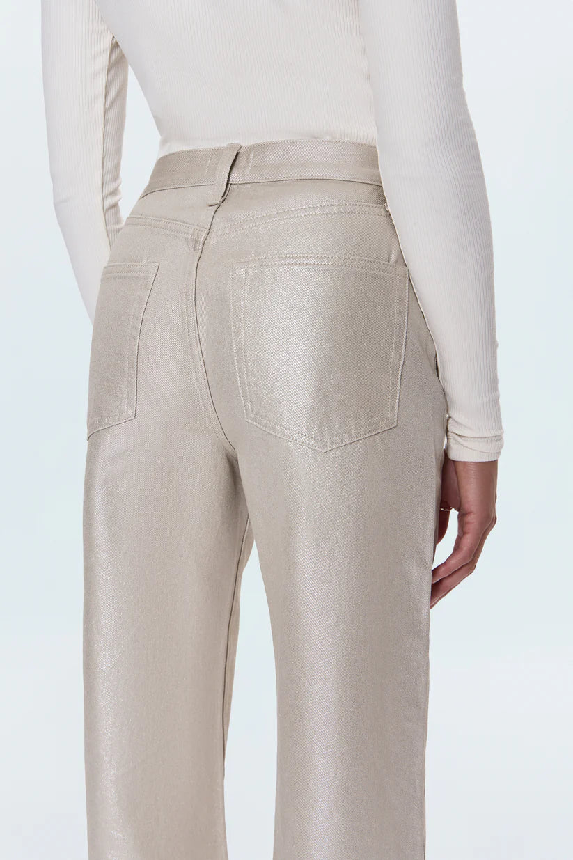 A signature shape, Tate features a high rise, bowed wide leg, and full-length 32" inseam that creates elegant movement and modern proportion. Crafted from 100% cotton non-stretch denim in Champagne Luster, a pearly coated finish that reflects light with every step for an effortlessly elevated look.