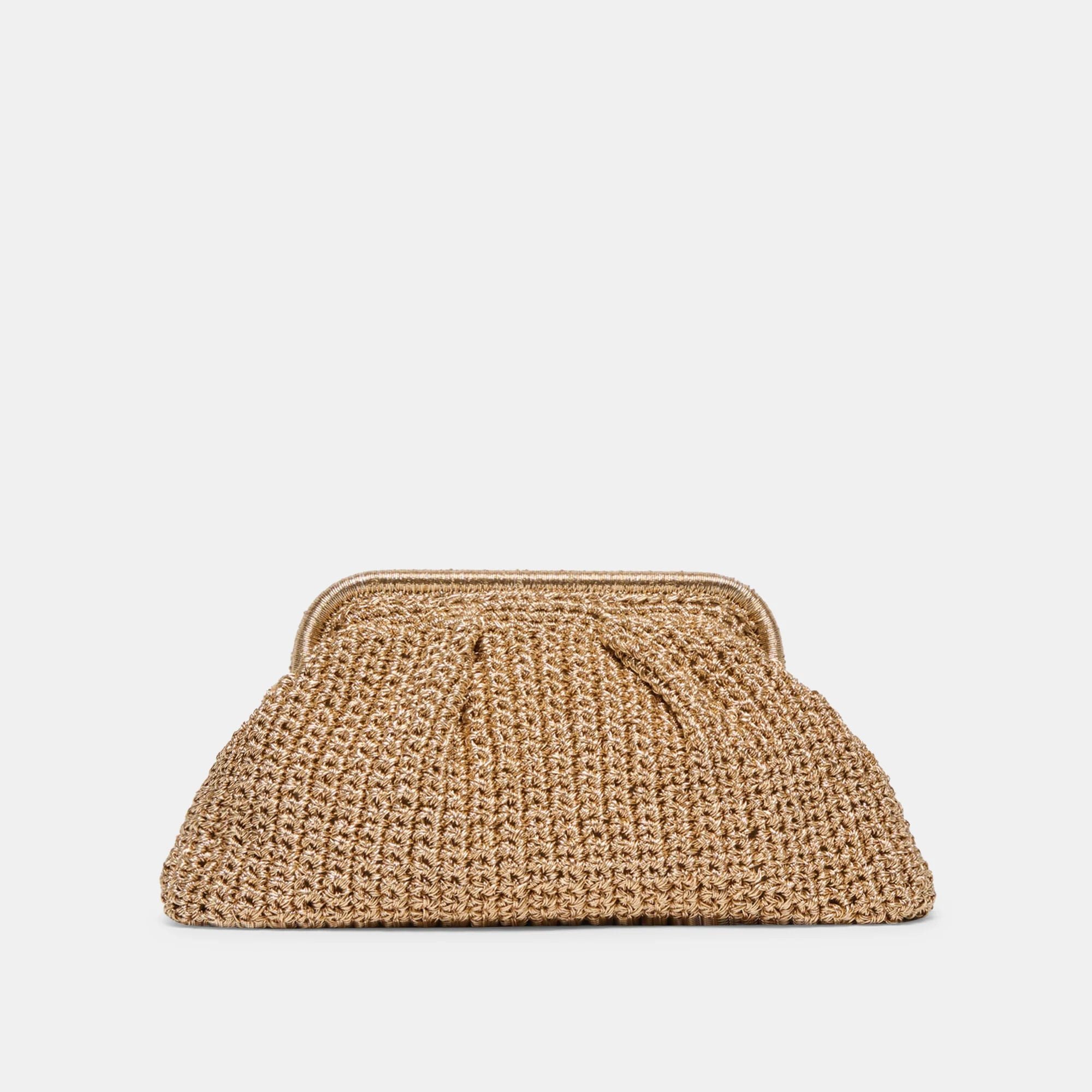 IONE is a versatile essential. This clutch can be dressed up or down as a standalone or with her detachable and practical crossbody strap. Crafted in shimmering gold crochet, her classic frame silhouette elevates any look while remaining perfectly neutral.