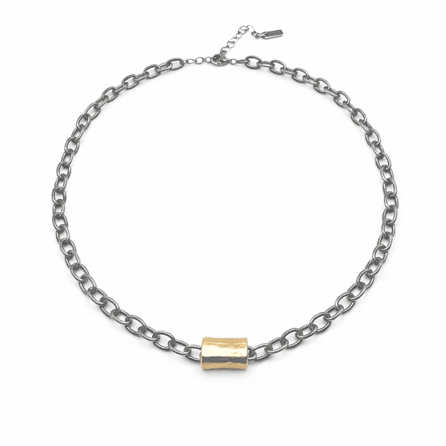 Featuring a brushed gold hammered barrel, paired with a bold, modern silver double chain, this piece is perfect with v-neck tees, tops and dresses.