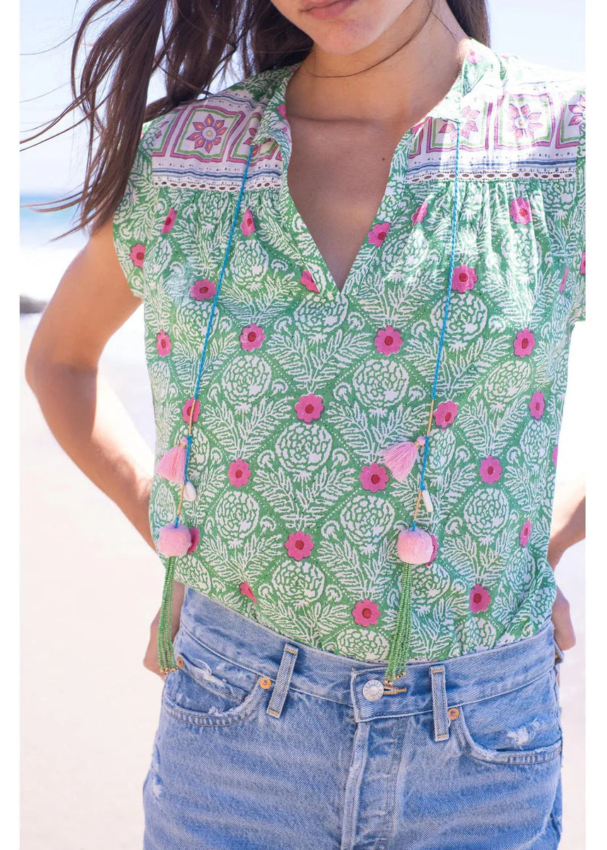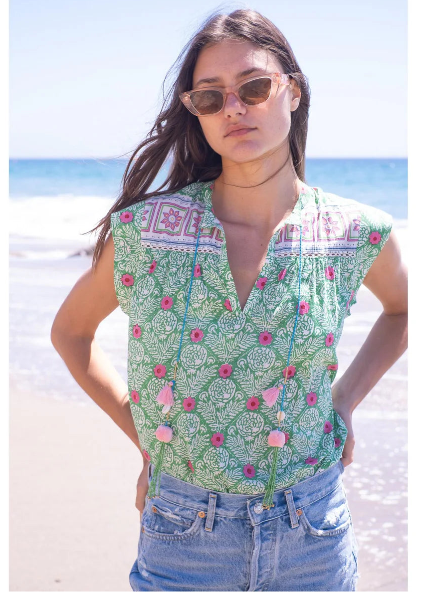 A hand-blocked silk cotton voile top, finished with soft cap sleeves and a refined tassel tie detail - an effortless blend of artisanal craft and understated elegance.