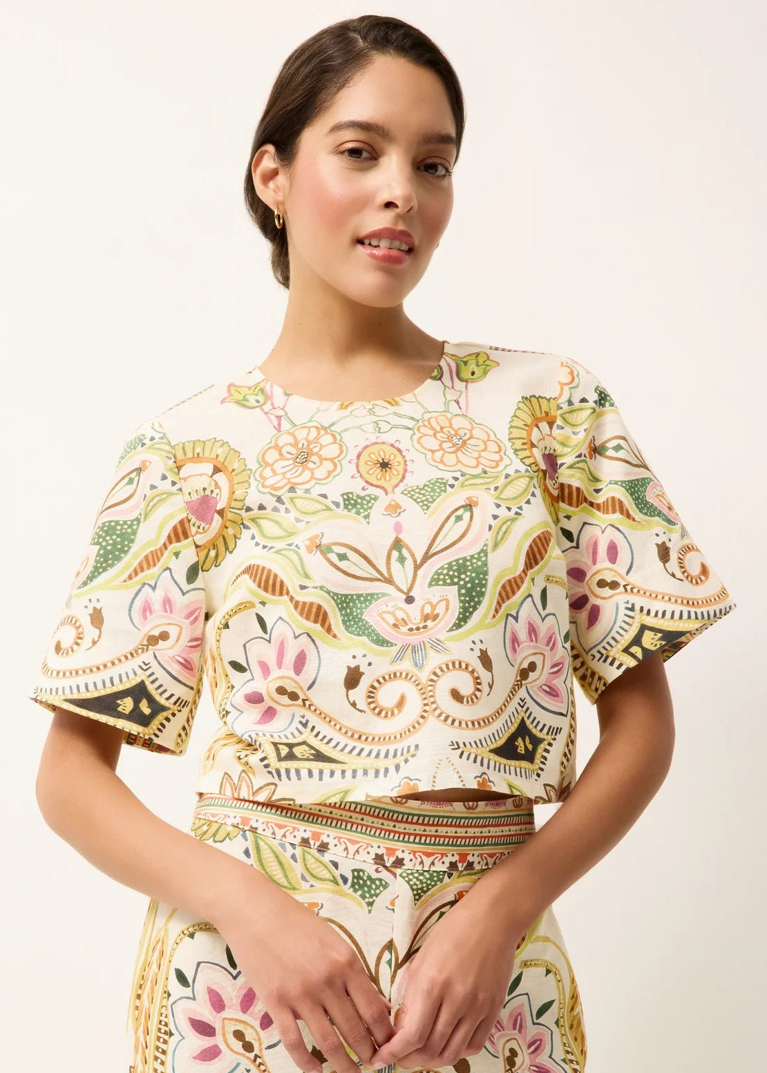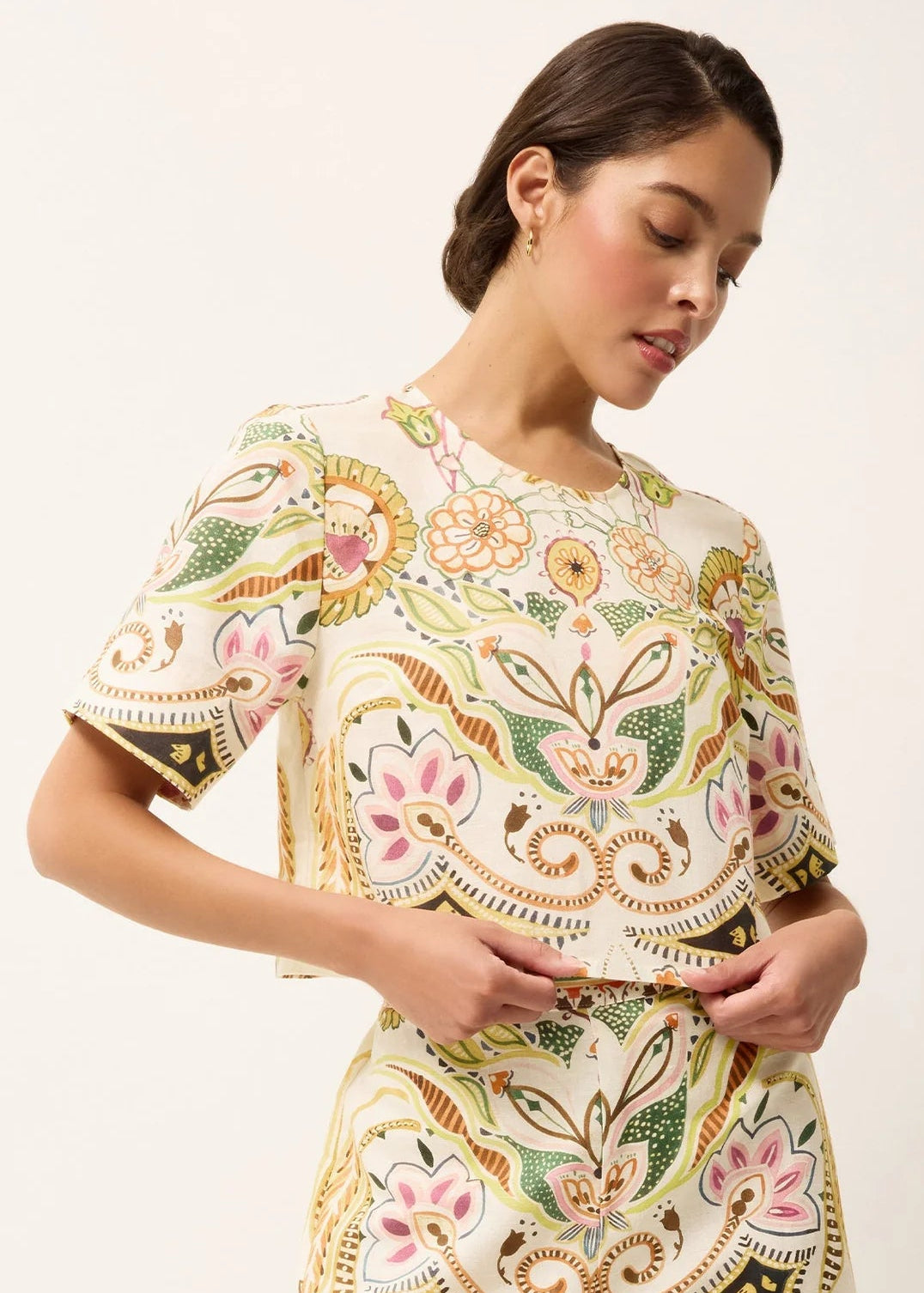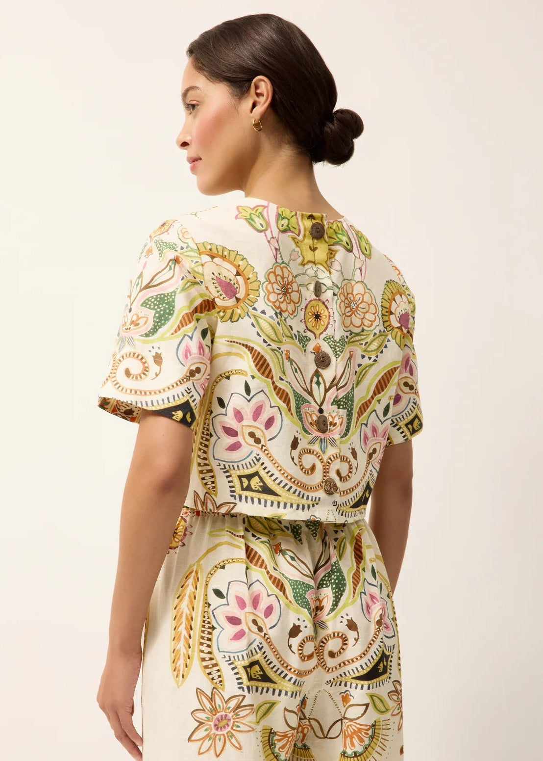This cropped linen-cotton silhouette pairs a clean, tailored cut with a buttoned back and an artful floral placement print.