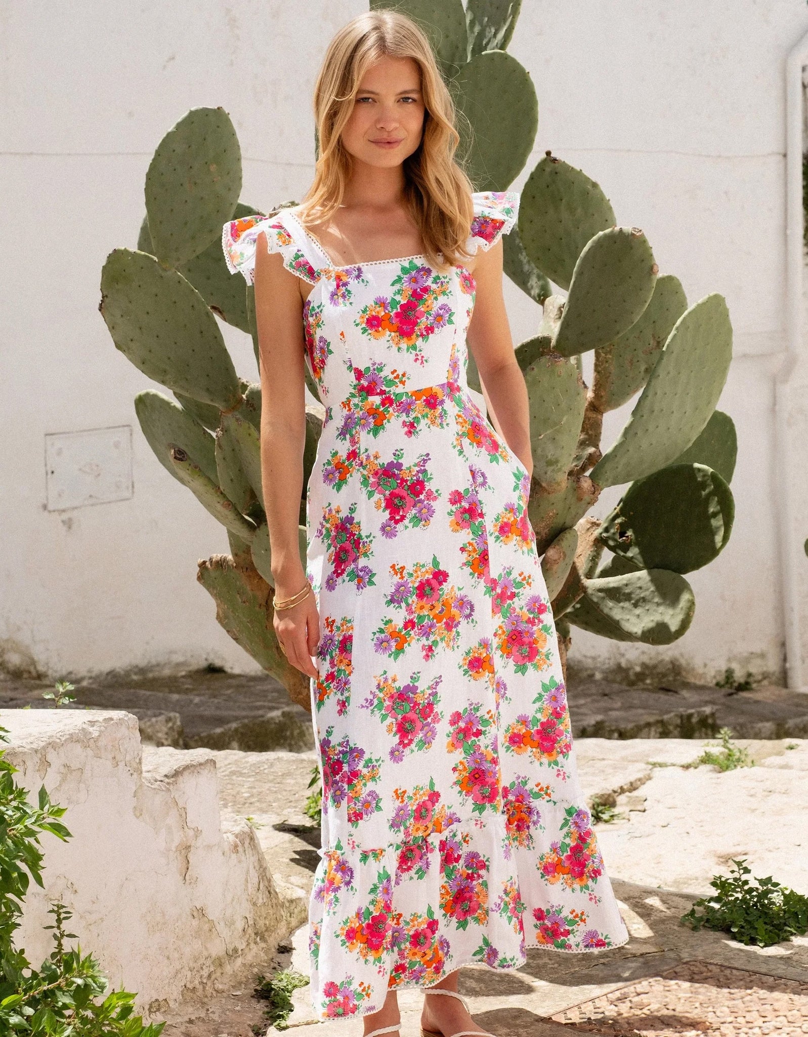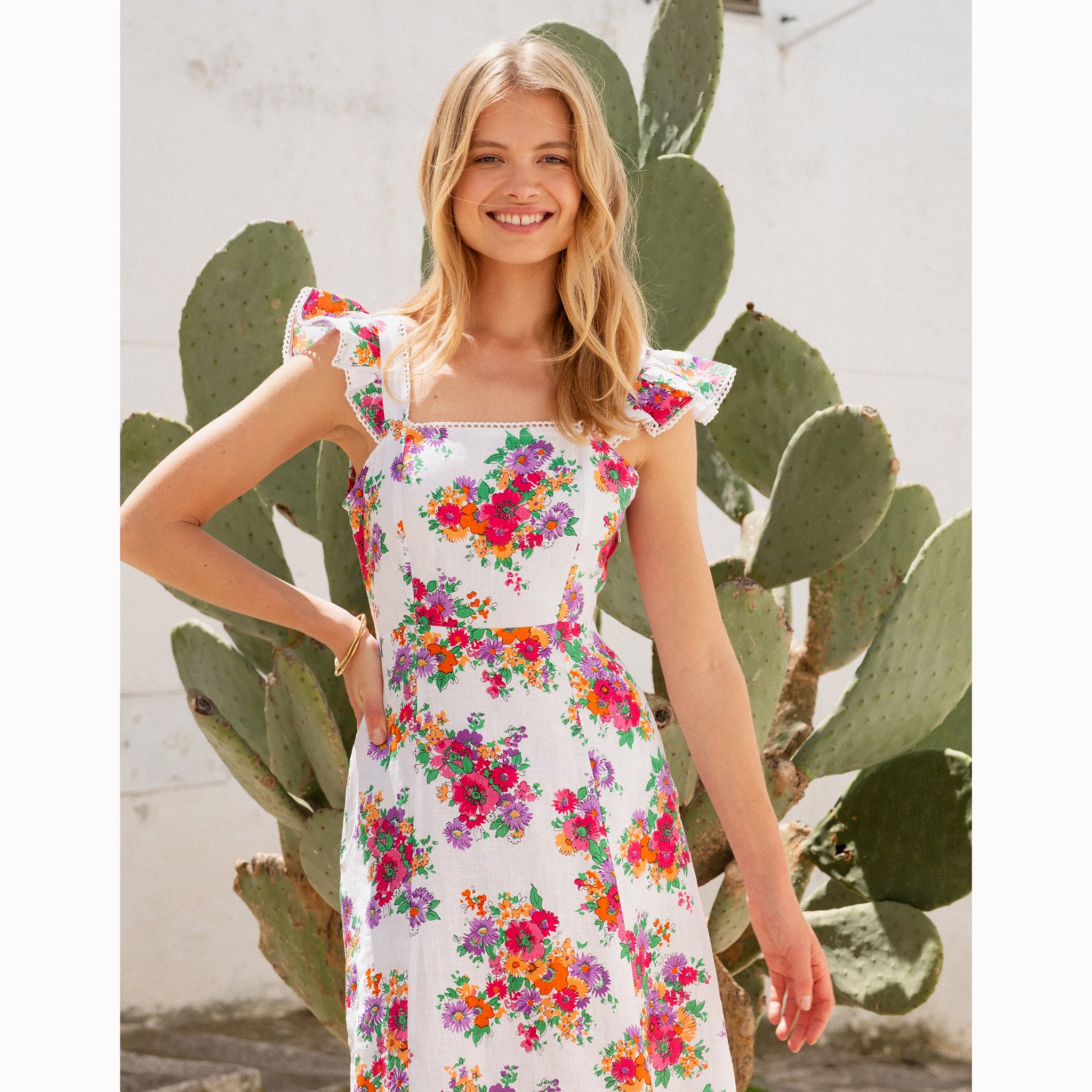 A stunning new shape that flatters every curve. The Mae Dress features a figure-hugging fit with darts for a tailored silhouette and a square neckline. The flutter sleeves and large bow tie at the back add a playful touch, while the fabric cleverly covers any bra straps.