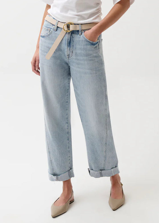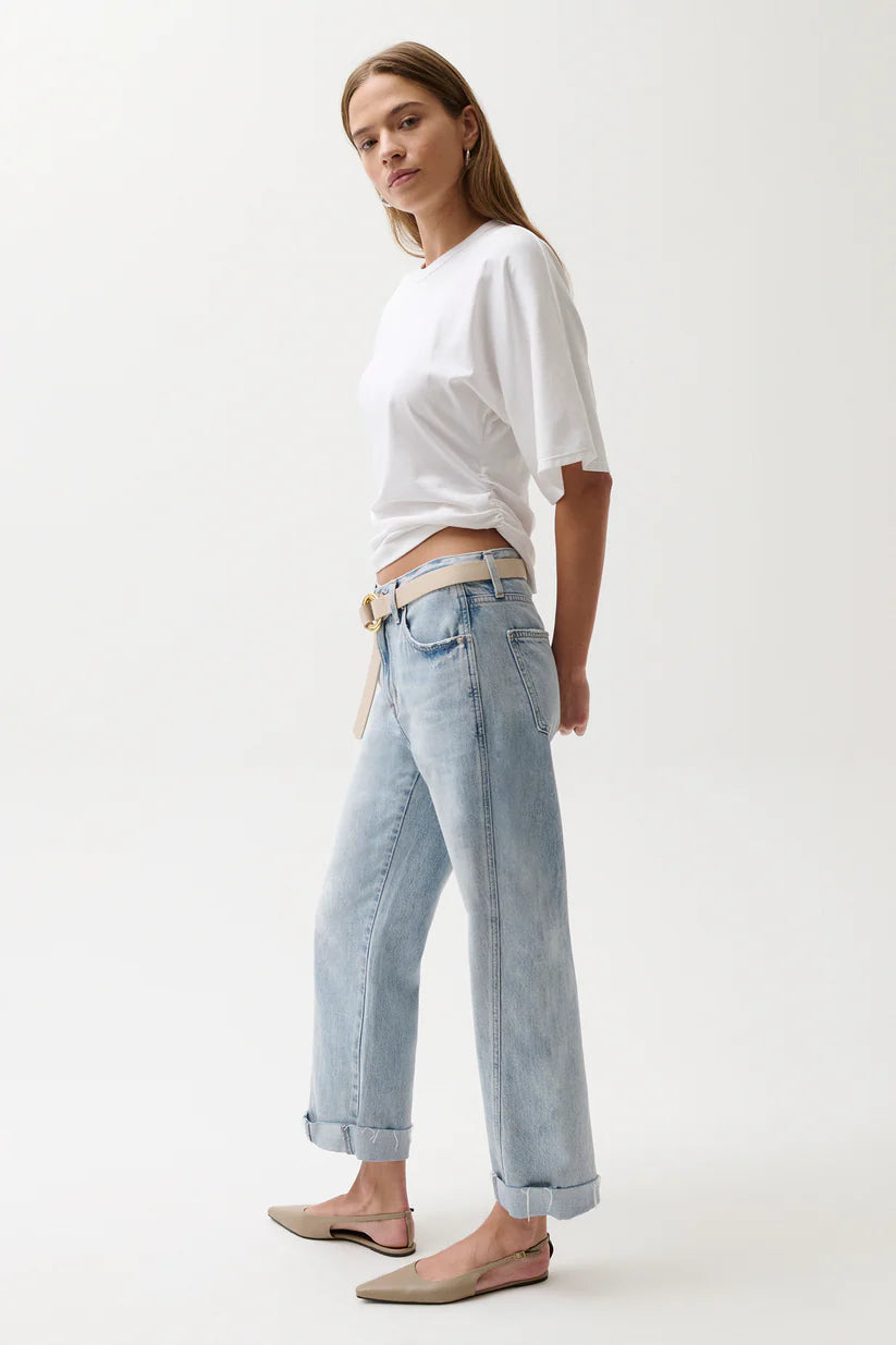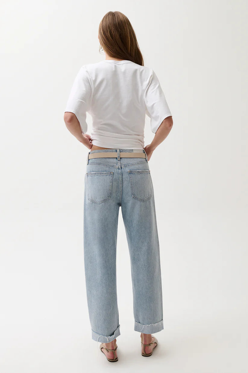 Your new go-to for effortless style. Kacey sits as a comfortable mid rise with an easy boyfriend fit and relaxed silhouette, finished with a 26 1/2" inseam. The stylish cuffed hem adds intentional finishing while thoughtful seaming details subtly elongate your figure. Crafted from lightweight rigid denim in Berkeley, a light wash that feels lived-in and loved.